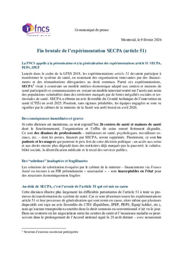 FNCS - Communiqué de presse Fin brutale de l’expérimentation SECPA (article 51)
