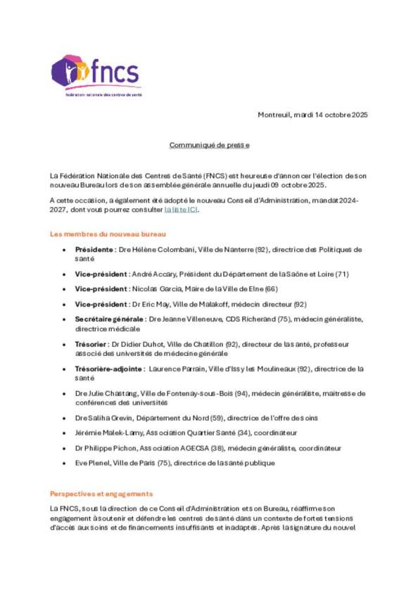 La Fédération Nationale des Centres de Santé (FNCS) est heureuse d'annoncer l'élection de son nouveau Bureau lors de son assemblée générale annuelle du jeudi 09 octobre 2025.