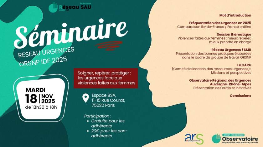 L'Observatoire Régional des Soins Non Programmés (ORSNP) d'Ile-de-France vous invite à participer au séminaire "Réseau Urgences - ORSNP Île-de-France" qui se tiendra le mardi 18 novembre 2025, de 13h30 à 18h à l’Espace BSA (Paris 20e).