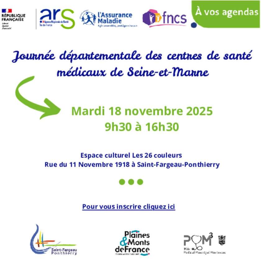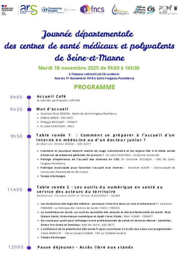 La 1ère journée départementale des centres de santé médicaux et polyvalents de Seine-et-Marne aura lieu le mardi 18 novembre de 9h à 16h30, à l’Espace culturel les 26 Couleurs, rue du 11 novembre 1918, à Saint-Fargeau-Ponthierry.