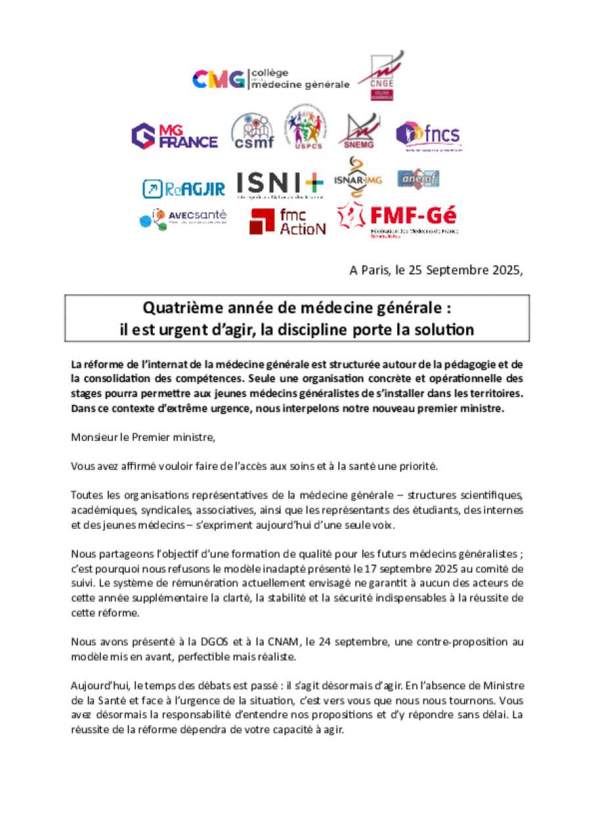 La réforme de l’internat de la médecine générale est structurée autour de la pédagogie et de la consolidation des compétences. Seule une organisation concrète et opérationnelle des stages pourra permettre aux jeunes médecins généralistes de s’installer dans les territoires. Dans ce contexte d’extrême urgence, nous interpelons notre nouveau premier ministre.